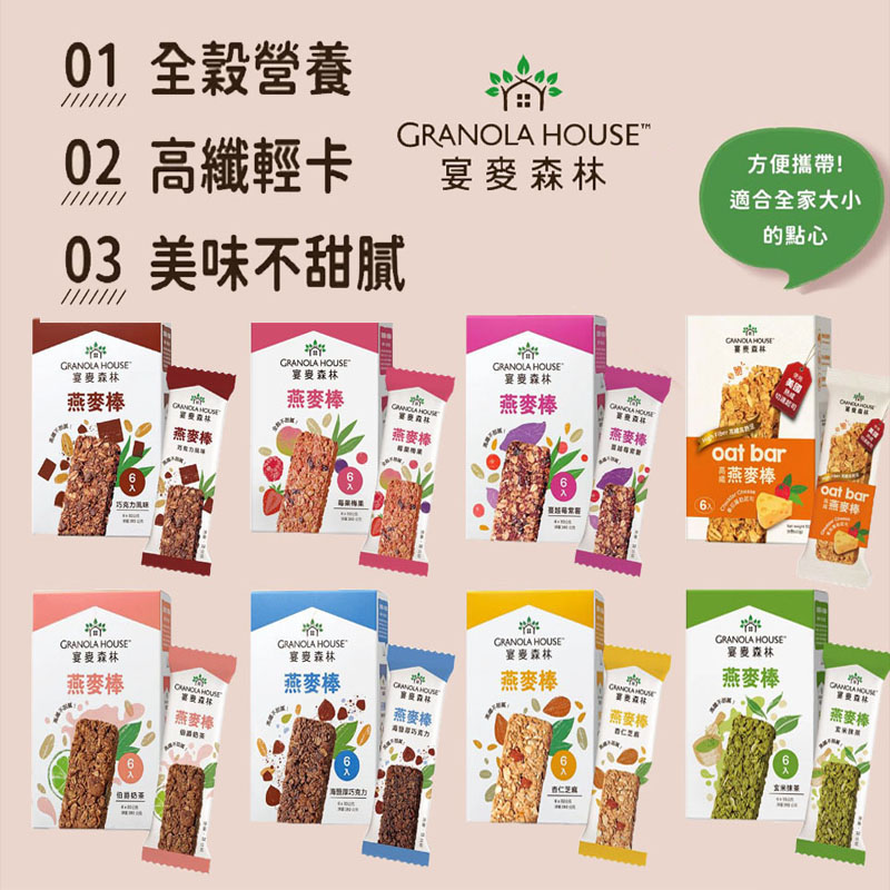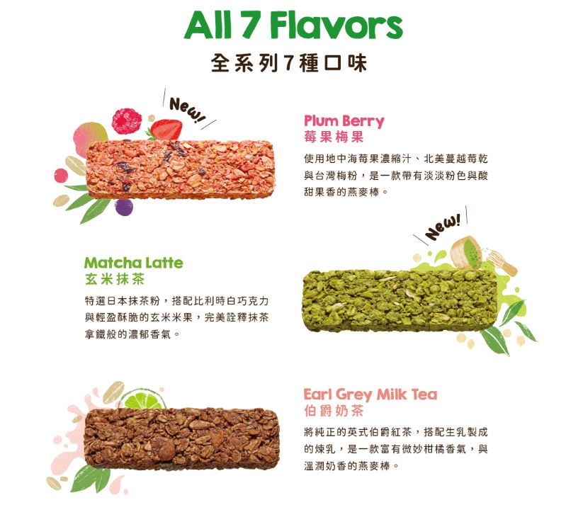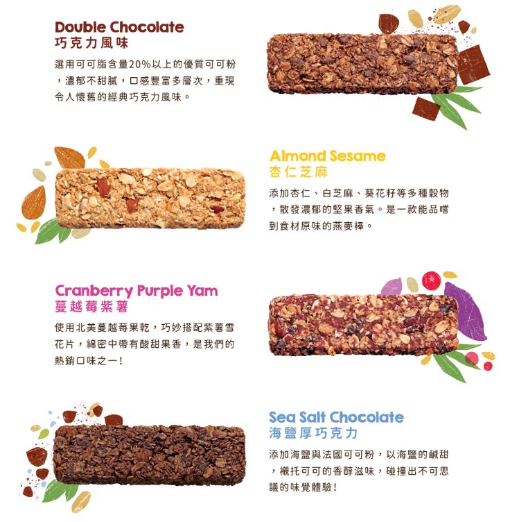 【番茄羅勒起司】第一支鹹食口味,經典食材打造義式披薩滋味 【海鹽厚巧克力】巧克力控必試,奢華感的濃郁 【莓果梅果】微酸輕甜味正好,莓果層次風味 【玄米抹茶】抹茶遇上白巧,吃的抹茶拿鐵 【蔓越莓紫薯】 莓果搭配紫薯片,多層次的鬆脆 【巧克力】經典濃郁風味,口感更為豐富 【杏仁芝麻】扎實堅果穀香,低甜度輕負擔 【伯爵奶茶】淡淡柑橘香氣,茶乳完美相融